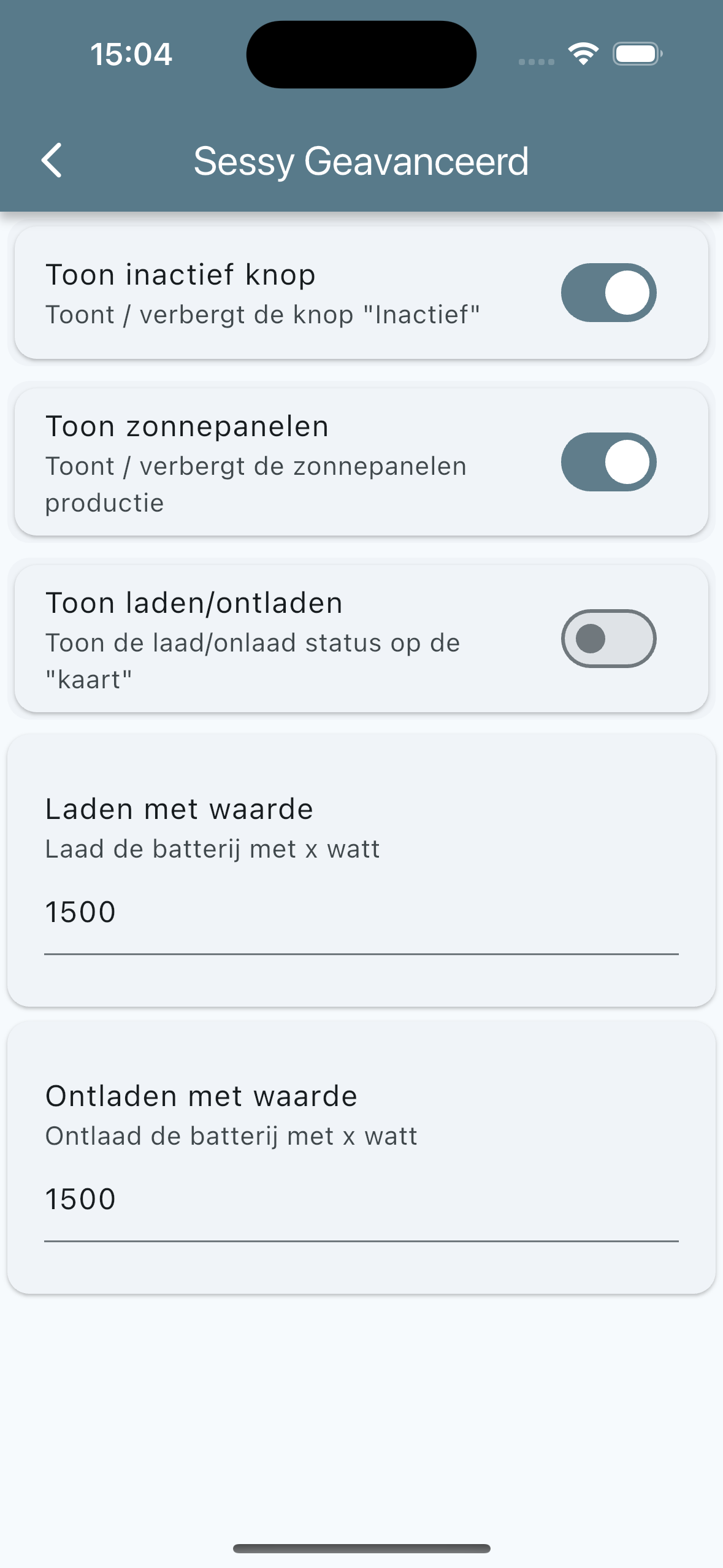 De app kan via het lokale netwerk communiceren met de thuisbatterij. De huidige status en strategie kunnen worden bekeken. Daarnaast kan de app de verschillende modi van de batterij activeren.