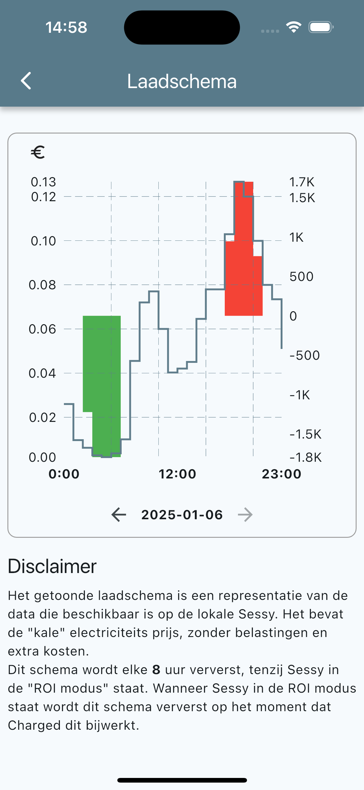 Wanneer de Sessy in de Dynamische modus staat zal hij laden en ontladen volgens een laadschema. Dit schema wordt in dit scherm getoond.