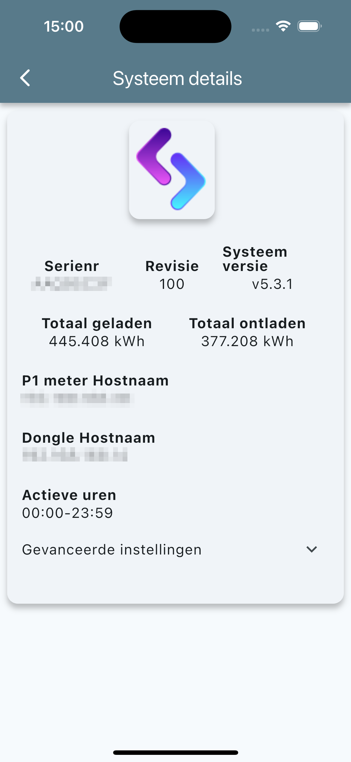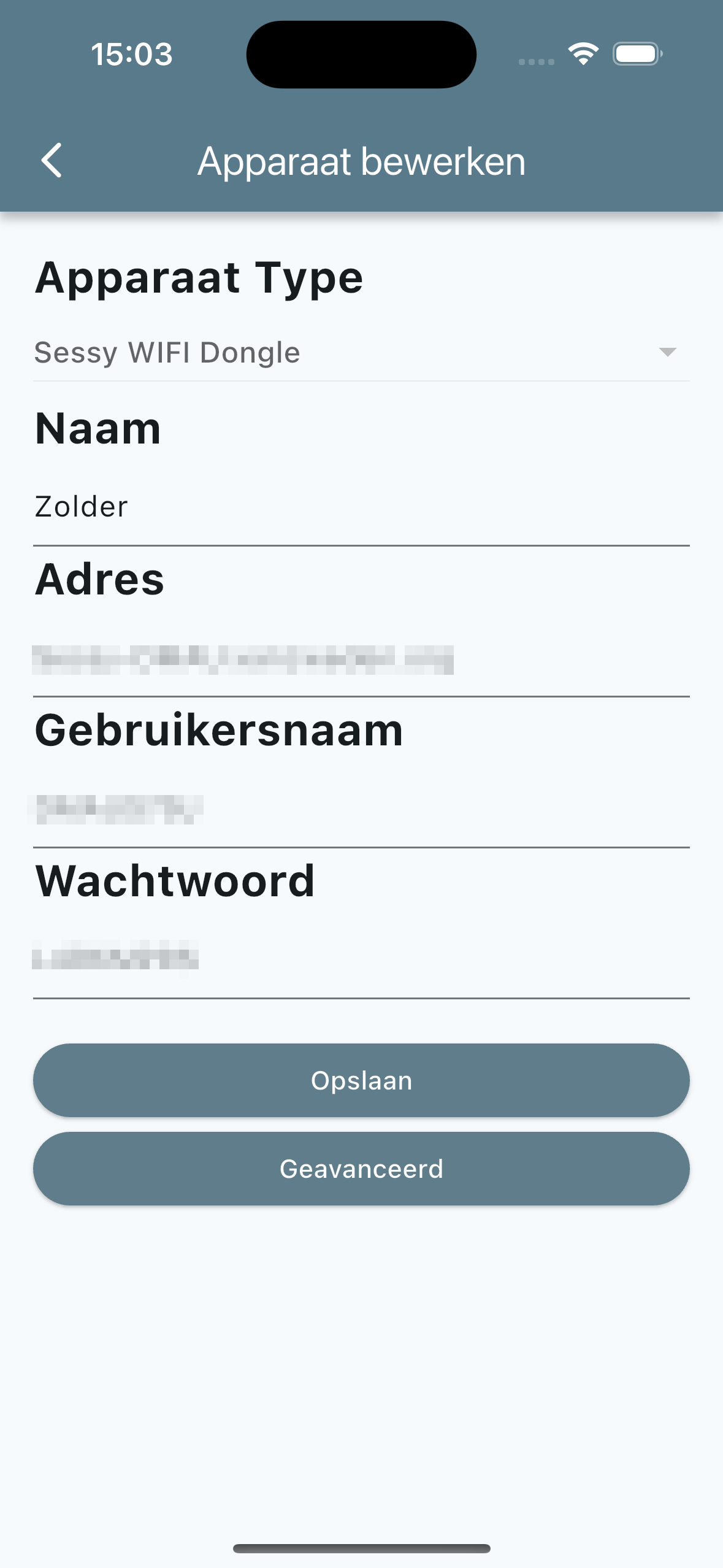 Binnen het “Apparaat bewerken” scherm kun je de gegevens voor het apparaat aanpassen. Dit zijn de details zoals de gebruikersnaam en het adres. Je kunt ook de “Geavanceerde” opties bewerken. Dit zijn zaken als wattage om mee te laden wanneer er op de “Laden” button getikt wordt.