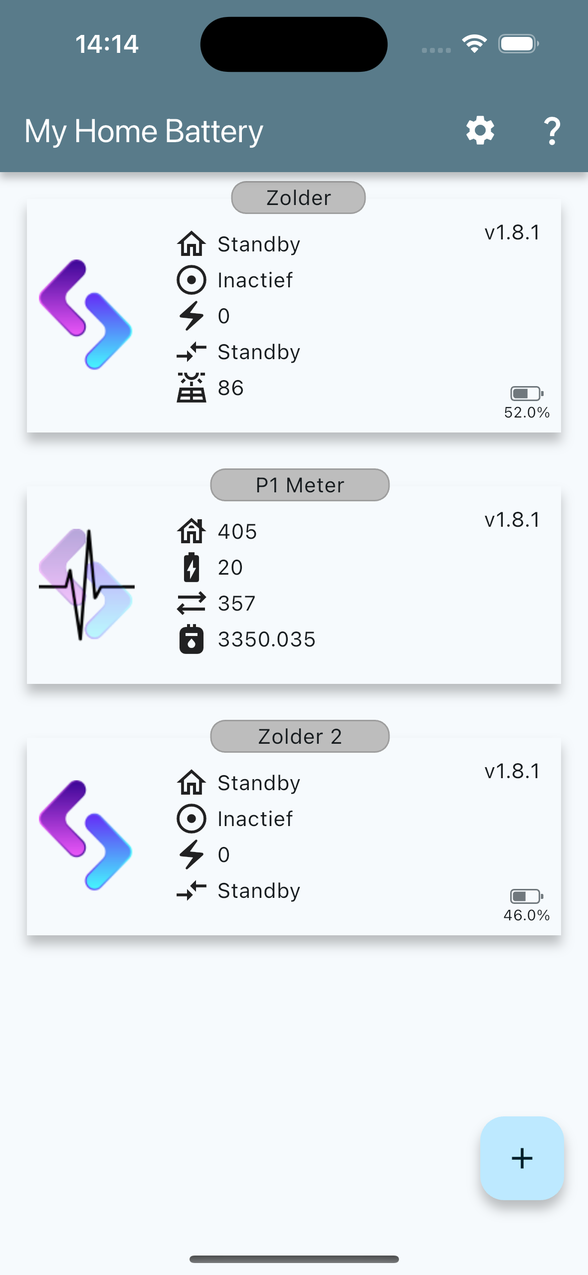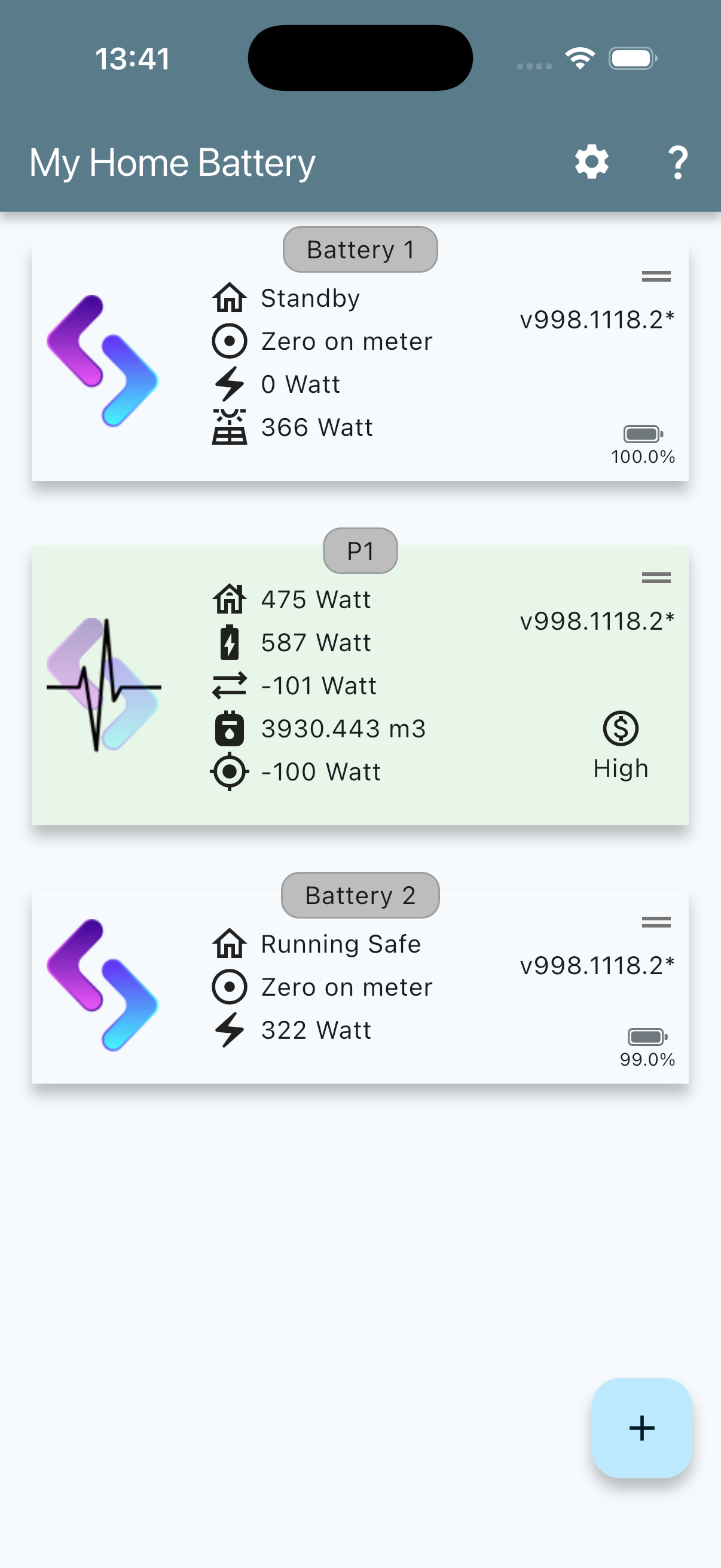 Het ‘Thuis’ scherm bevat kaarten van alle toegevoegde batterijen en laat de huidige status zien. Onderstaand een screenshot met daarin 1 batterij (en een P1 meter). Het is mogelijk meerdere batterijen toe te voegen.